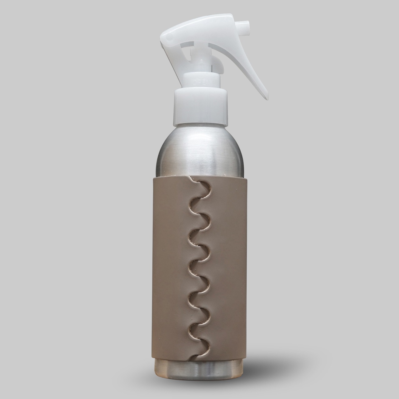 表面にラバーコーティングを施した天然のレザーにグラフィックを型押しした上質なカバーがセットされたスプレーボトル。
